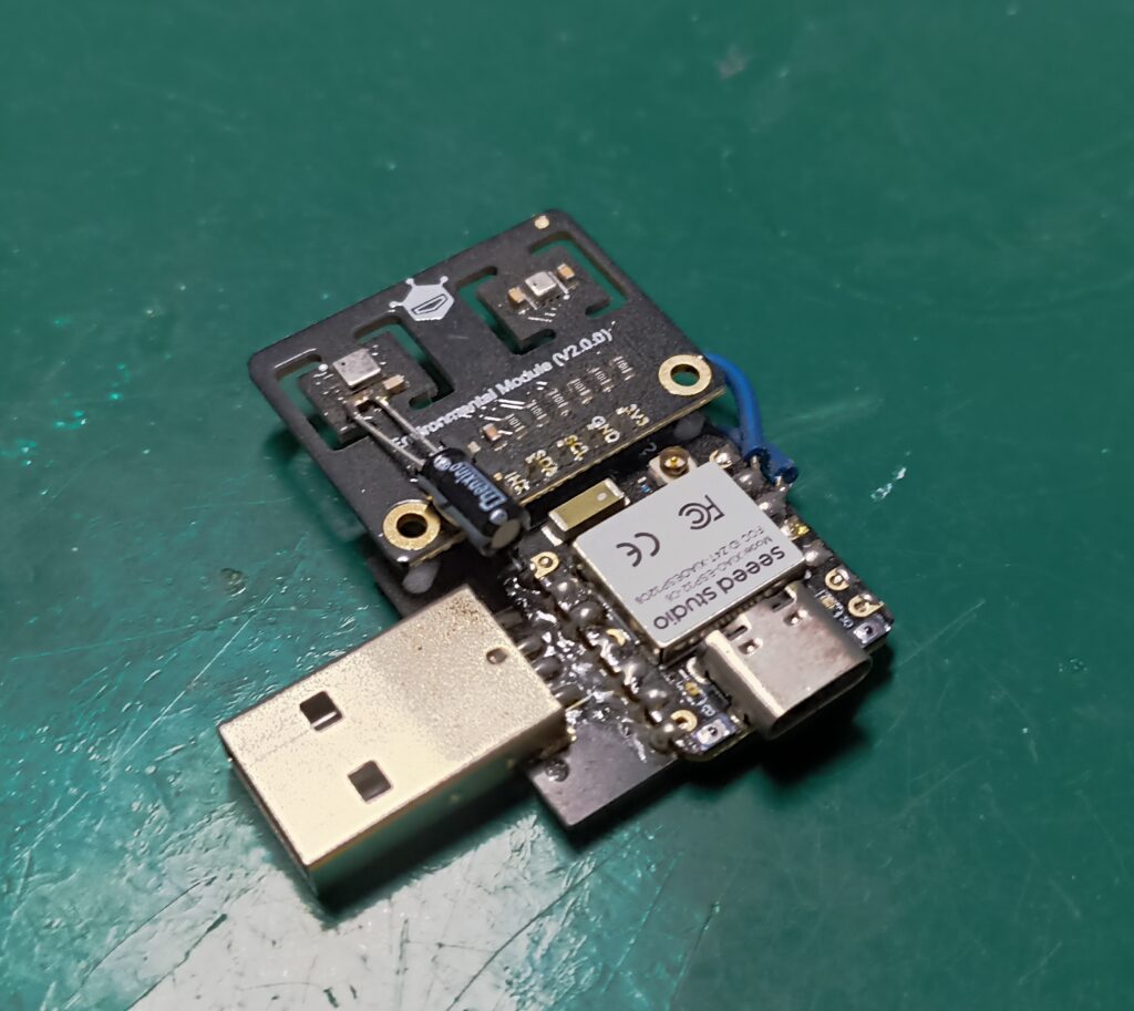 That electrolytic capacitor soldered on top of things is for power supply stability, specially for the ENS160. Those two blue wires are for inverting SDA and SCL, since this board was originally made for another part number of sensor. Besides that, it is a matter of connecting it to a USB charger and getting it running.